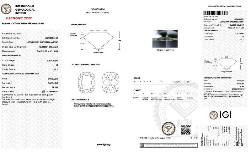 | 1.24 | Cushion Brilliant | D | VS1 | IGI | 65.0 | 56 | 7.66x5.71x3.71 | Contact Vendor |