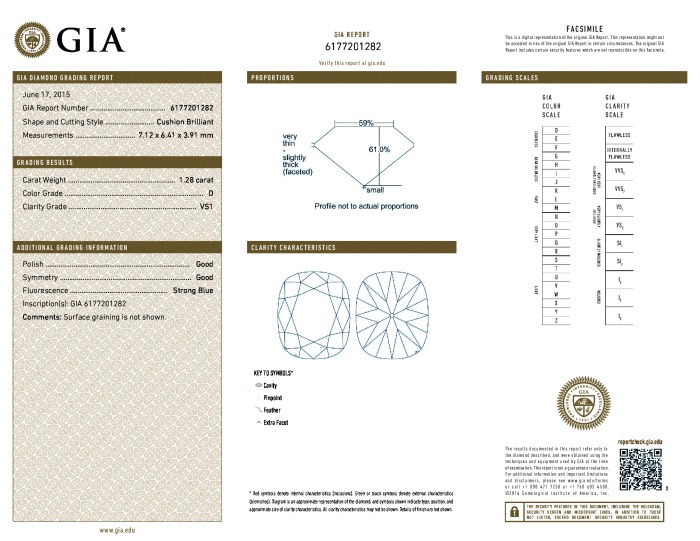 | 1.28 | Cushion Brilliant | D | VS1 | GIA | 61.0 | 59 | 7.12x6.41x3.91 | Contact Vendor |