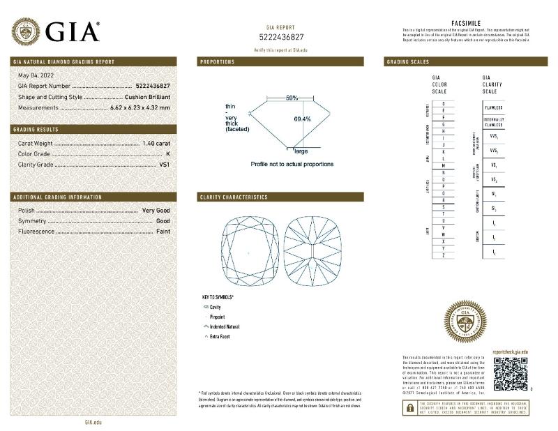 | 1.40 | Cushion Brilliant | K | VS1 | GIA | 69.4 | 59 | 6.62x6.23x4.32 | Contact Vendor |