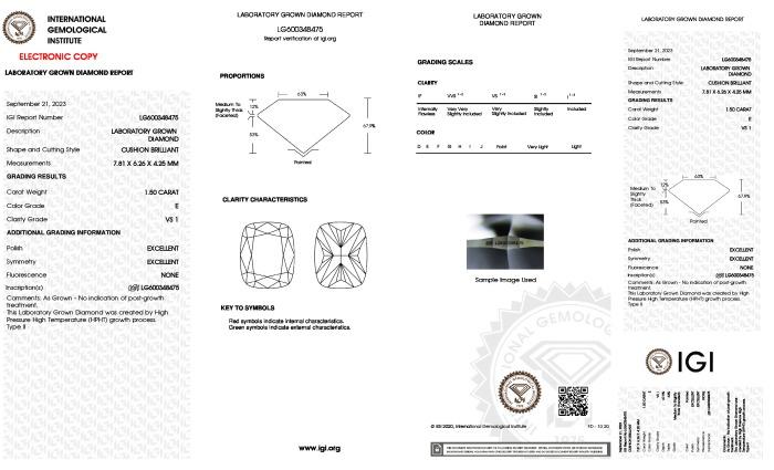 | 1.50 | Cushion Brilliant | E | VVS2 | IGI | 68.2 | 60 | 7.69x6.17x4.21 | Contact Vendor |