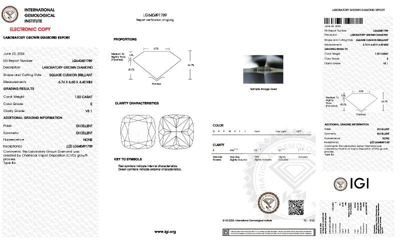 | 1.50 | Cushion Brilliant | E | VS1 | IGI | 66.7 | 62 | 6.74x6.60x4.40 | Contact Vendor |