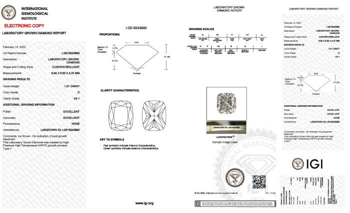 | 1.51 | Cushion Brilliant | D | VS1 | IGI | 70.1 | 63 | 7.51x6.16x4.32 | Contact Vendor |