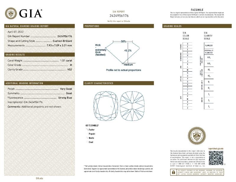 | 1.51 | Cushion Brilliant | M | VS2 | GIA | 45.2 | 58 | 7.93x7.09x3.21 | Contact Vendor |
