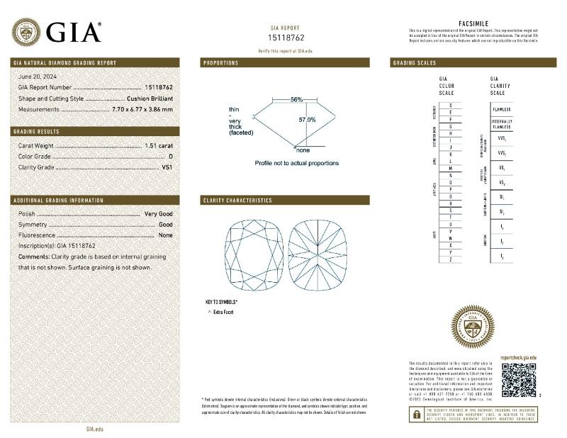 | 1.51 | Cushion Brilliant | D | VS1 | GIA | 57.0 | 56 | 7.70x6.77x3.86 | Contact Vendor |