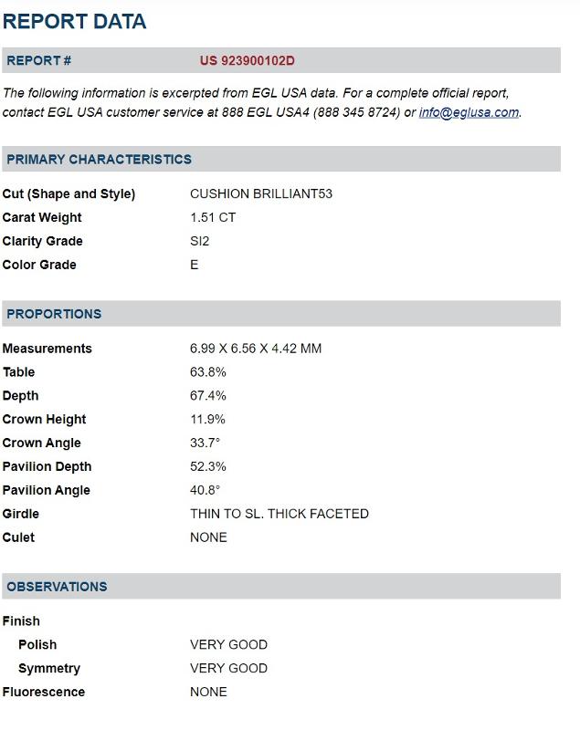 | 1.51 | Cushion Brilliant | E | SI2 | EGLUSA | 67.4 | 63 | 6.99x6.56x4.42 | Contact Vendor |