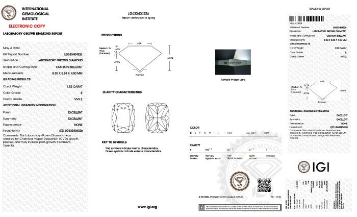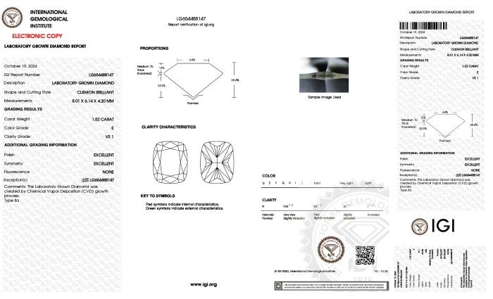 | 1.52 | Cushion Brilliant | E | VVS2 | IGI | 66.1 | 61 | 8.13x5.96x3.94 | Contact Vendor |