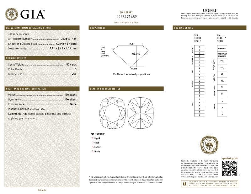 | 1.52 | Cushion Brilliant | F | VVS2 | GIA | 64.7 | 62 | 7.79x6.33x4.10 | Contact Vendor |