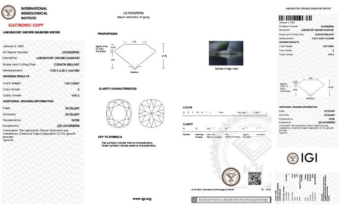 | 1.53 | Cushion Brilliant | E | VVS2 | IGI | 68.2 | 60 | 7.89x6.13x4.18 | Contact Vendor |