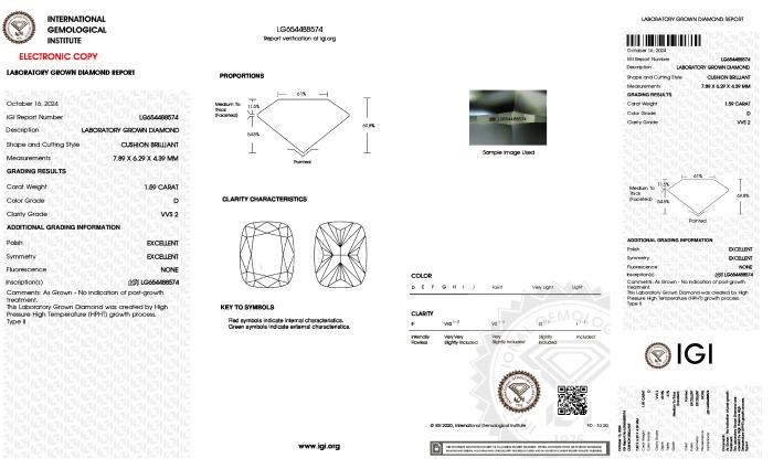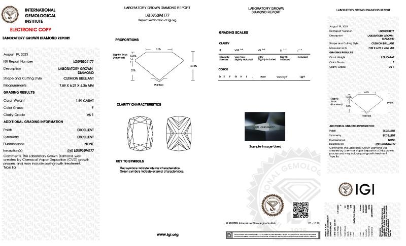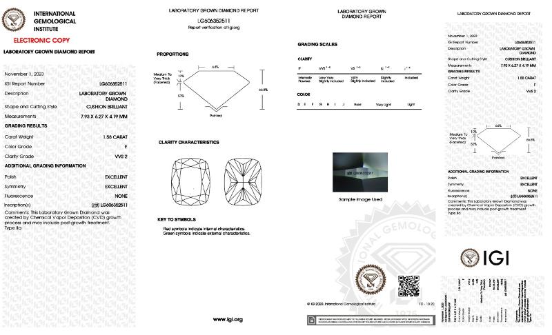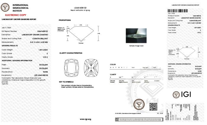 | 1.59 | Cushion Brilliant | F | VVS2 | IGI | 68.2 | 63 | 8.02x6.28x4.28 | Contact Vendor |