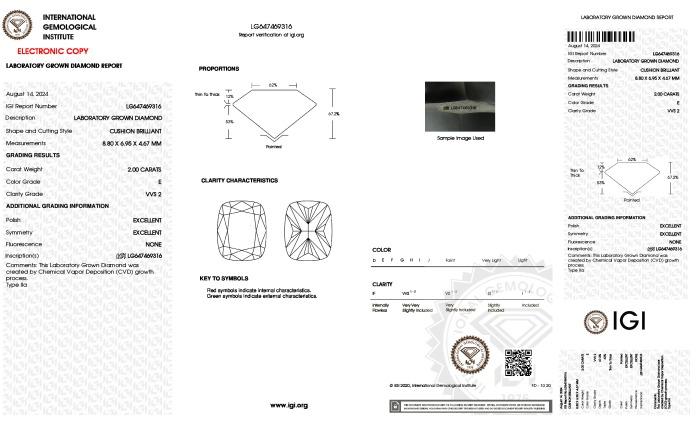| 2.00 | Cushion Brilliant | E | VS1 | IGI | 66.5 | 64 | 8.65x6.59x4.38 | Contact Vendor |