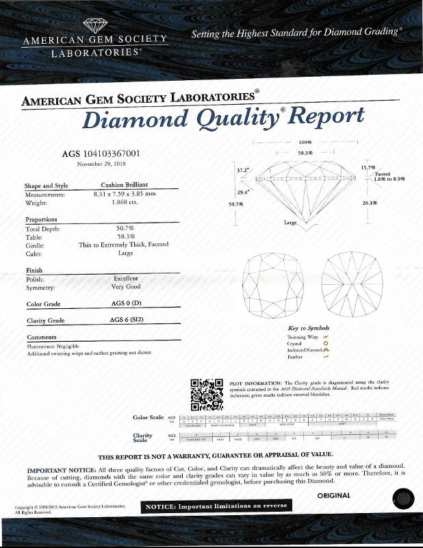 | 1.86 | Cushion Brilliant | D | SI2 | AGS | 50.7 | 58 | 8.31x7.59x3.85 | Contact Vendor |