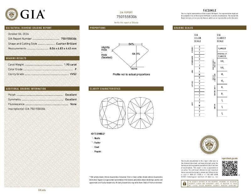 | 1.90 | Cushion Brilliant | F | VVS2 | GIA | 64.9 | 64 | 8.06x6.83x4.43 | Contact Vendor |
