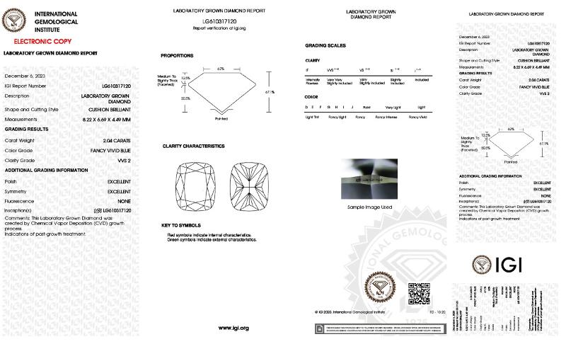 | 2.04 | Cushion Brilliant | D | VVS2 | IGI | 67.6 | 64 | 8.57x6.95x4.70 | Contact Vendor |