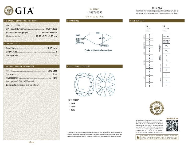 | 2.05 | Cushion Brilliant | F | SI1 | GIA | 67.1 | 59 | 7.93x7.40x4.96 | Contact Vendor |