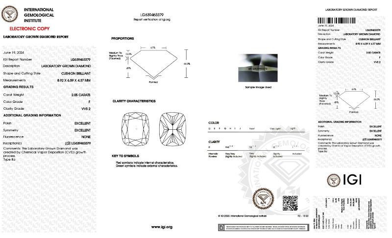 | 2.04 | Cushion Brilliant | F | VVS2 | IGI | 63.9 | 52 | 9.37x6.84x4.37 | Contact Vendor |