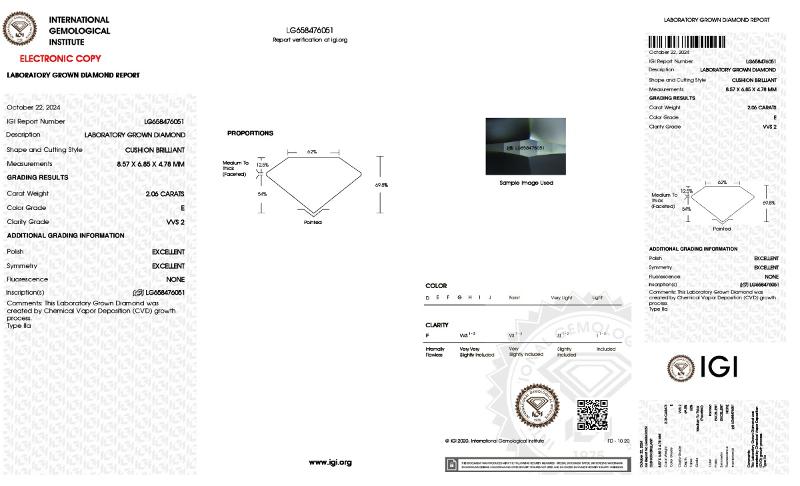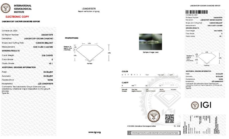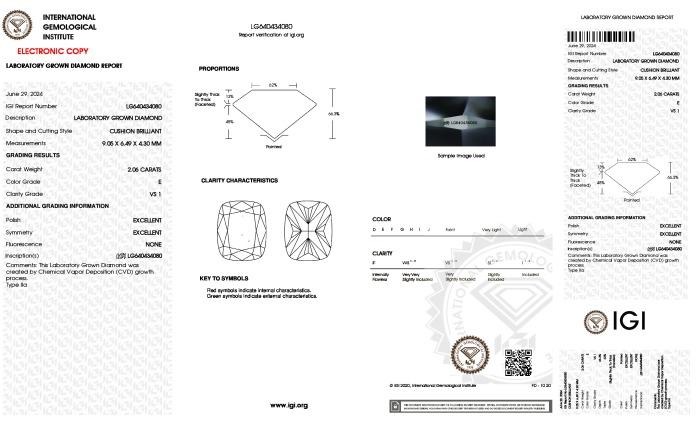 | 2.06 | Cushion Brilliant | E | VS1 | IGI | 68.0 | 63 | 8.68x6.82x4.64 | Contact Vendor |