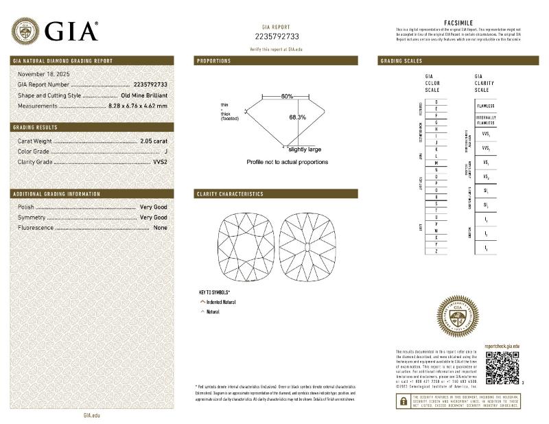 | 2.05 | Cushion Brilliant | J | VVS2 | GIA | 68.3 | 60 | 8.28x6.76x4.62 | Contact Vendor |