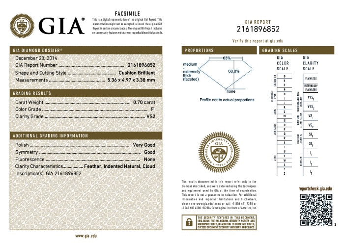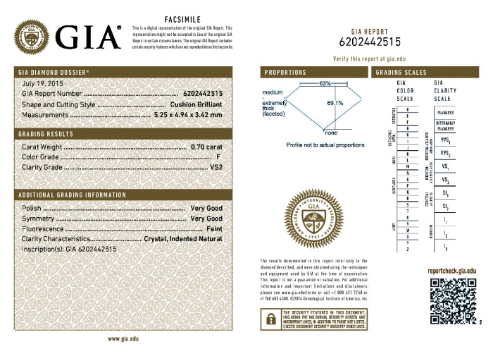 | 0.70 | Cushion Brilliant | F | VS2 | GIA | 69.1 | 63 | 5.25x4.94x3.42 | Contact Vendor |
