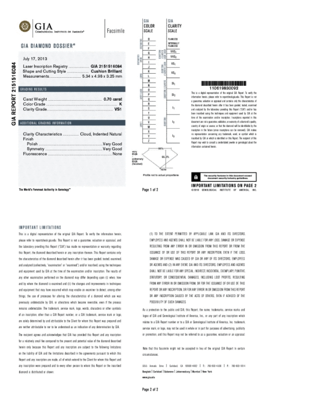 | 0.70 | Cushion Brilliant | K | VS1 | GIA | 65.3 | 66 | 5.34x4.98x3.25 | Contact Vendor |