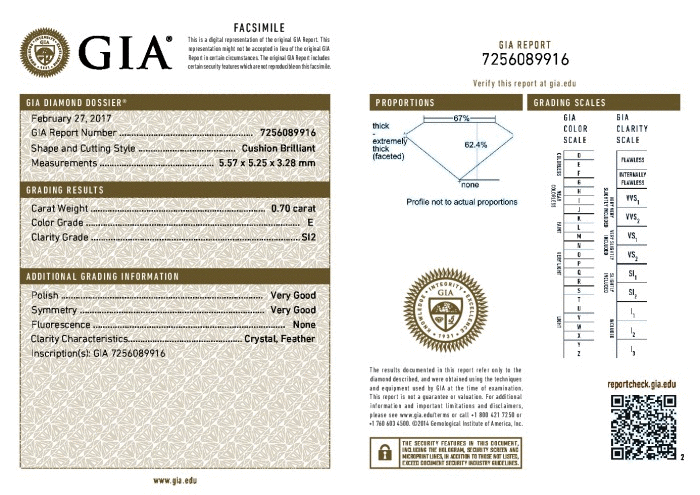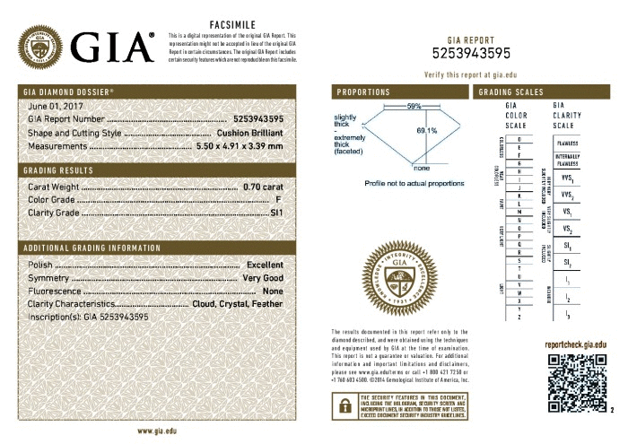 | 0.70 | Cushion Brilliant | F | SI1 | GIA | 69.1 | 59 | 5.50x4.91x3.39 | Contact Vendor |