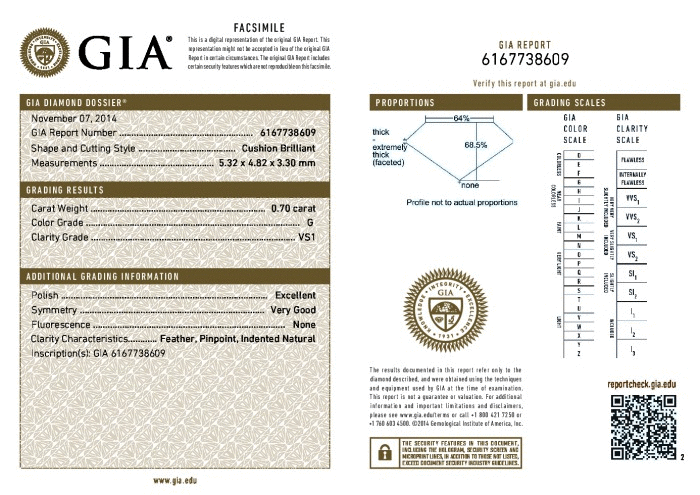 | 0.70 | Cushion Brilliant | G | VS1 | GIA | 68.7 | 63 | 5.34x5.00x3.44 | Contact Vendor |