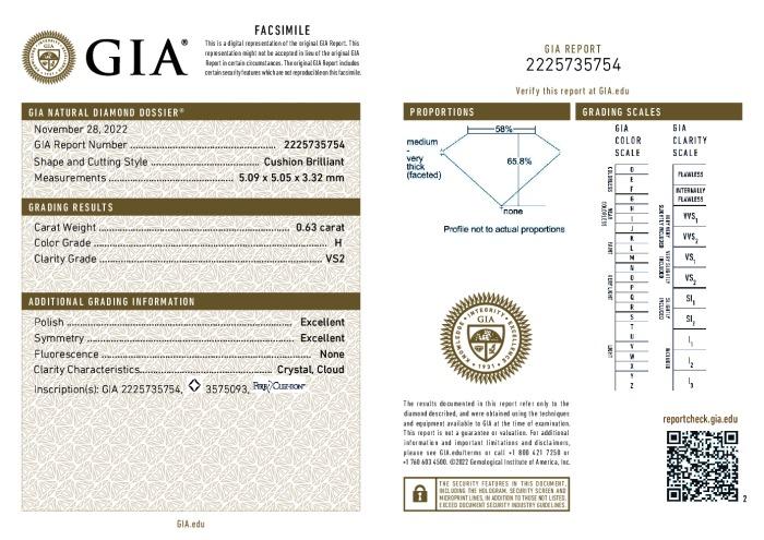 | 0.63 | Cushion Brilliant | H | VS2 | GIA | 65.8 | 58 | 5.09x5.05x3.32 | Contact Vendor |