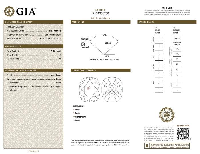 | 0.70 | Cushion Brilliant | G | I1 | GIA | 68.8 | 57 | 5.24x5.19x3.57 | Contact Vendor |