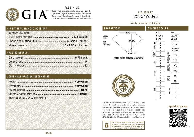| 0.70 | Cushion Brilliant | F | VS2 | GIA | 67.5 | 57 | 5.82x4.82x3.26 | Contact Vendor |