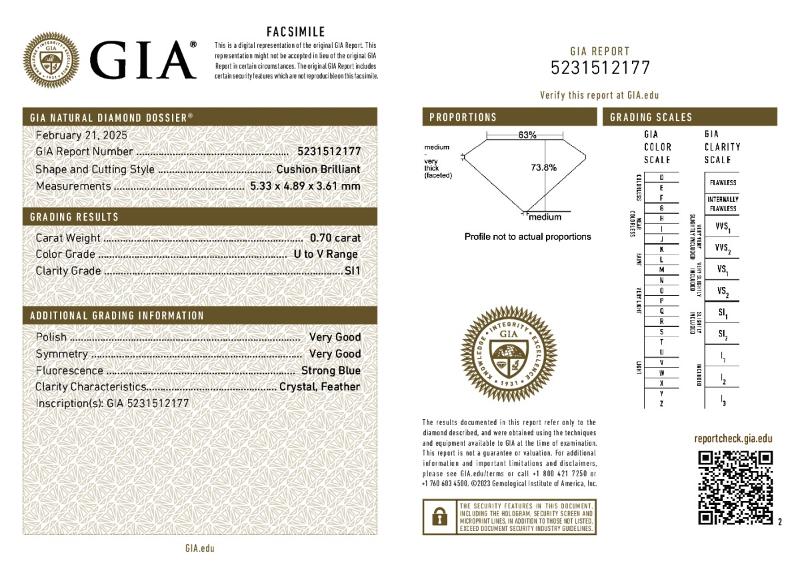 | 0.70 | Cushion Brilliant | U-V | SI1 | GIA | 73.8 | 63 | 5.33x4.89x3.61 | Contact Vendor |