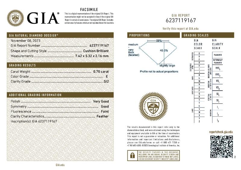 | 0.70 | Cushion Brilliant | E | SI2 | GIA | 40.5 | 59 | 7.42x5.32x2.16 | Contact Vendor |