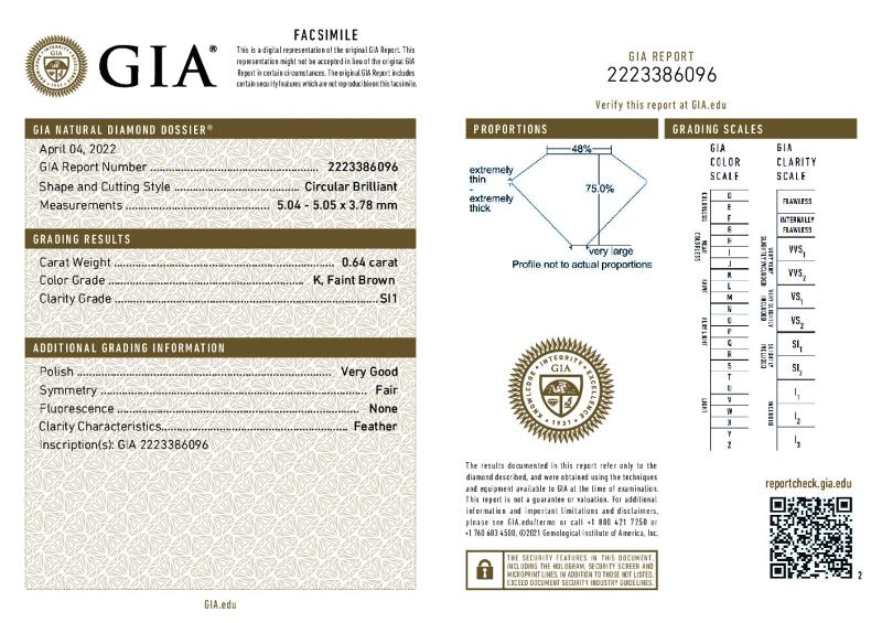 | 0.64 | Cushion Brilliant | K | SI1 | GIA | 75.0 | 48 | 5.04x5.05x3.78 | Contact Vendor |