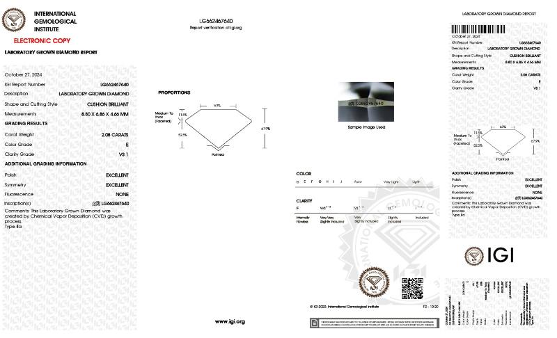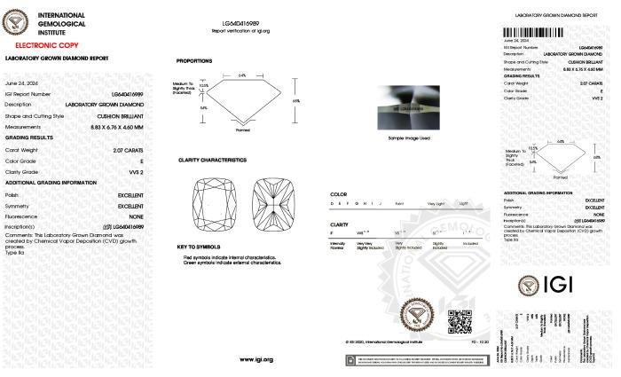 | 2.07 | Cushion Brilliant | E | VVS2 | IGI | 68.0 | 64 | 8.83x6.76x4.60 | Contact Vendor |