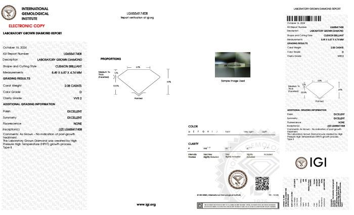 | 2.08 | Cushion Brilliant | D | VVS2 | IGI | 64.0 | 55 | 9.37x6.45x4.13 | Contact Vendor |