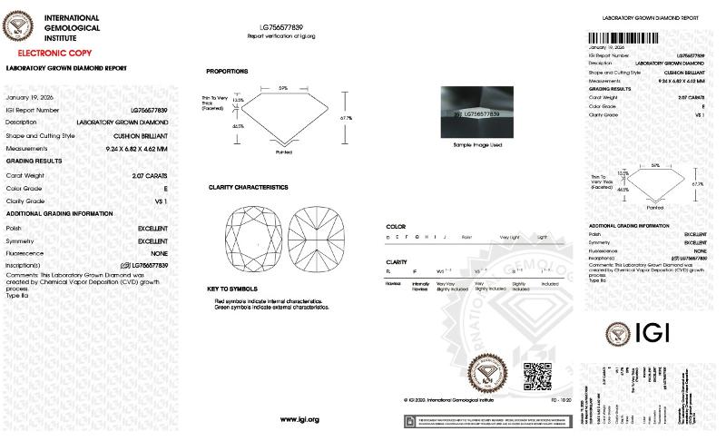 | 2.06 | Cushion Brilliant | E | VVS2 | IGI | 66.5 | 60 | 9.10x6.54x4.35 | Contact Vendor |