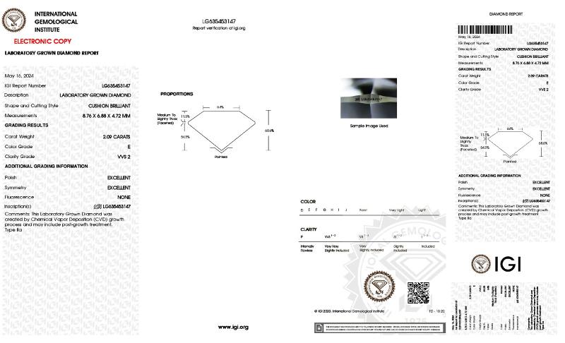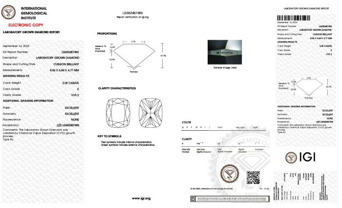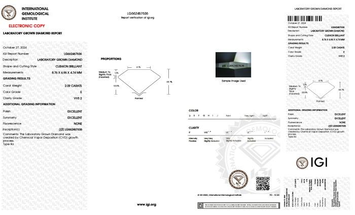 | 2.09 | Cushion Brilliant | F | VVS2 | IGI | 66.8 | 63 | 8.81x6.75x4.51 | Contact Vendor |