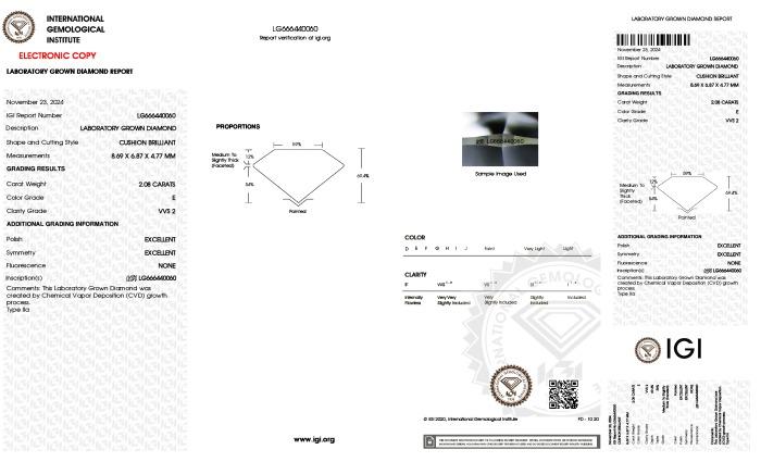 | 2.08 | Cushion Brilliant | E | VVS2 | IGI | 69.5 | 64 | 8.62x6.89x4.79 | Contact Vendor |