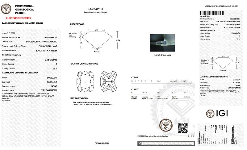 | 2.12 | Cushion Brilliant | E | VS1 | IGI | 66.9 | 62 | 8.79x6.65x4.45 | Contact Vendor |