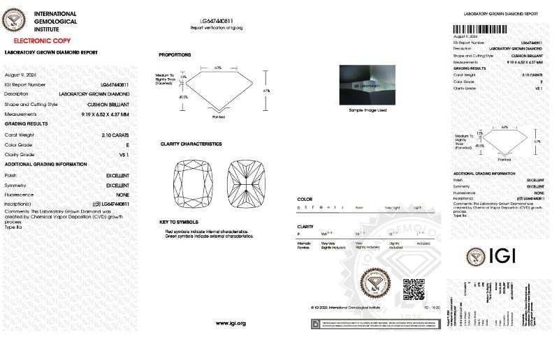 | 2.10 | Cushion Brilliant | E | VVS2 | IGI | 65.3 | 62 | 9.15x6.65x4.34 | Contact Vendor |