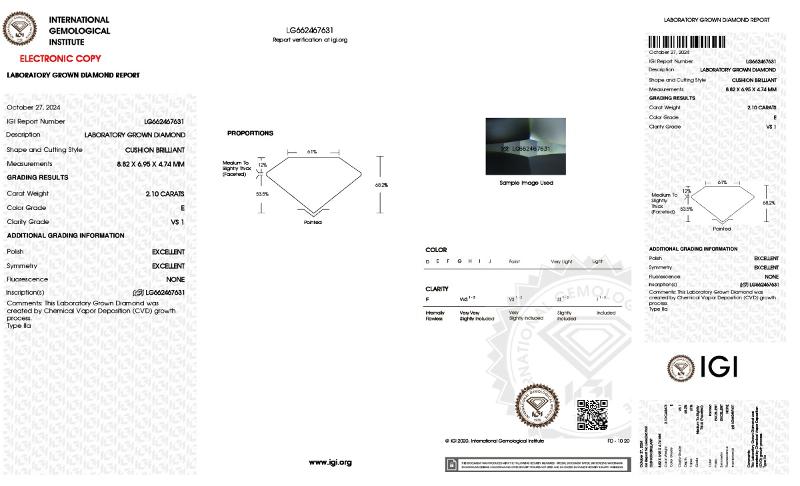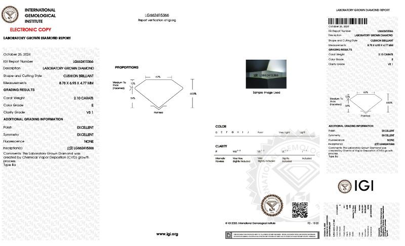 | 2.10 | Cushion Brilliant | E | VVS2 | IGI | 66.7 | 67 | 8.98x6.52x4.35 | Contact Vendor |