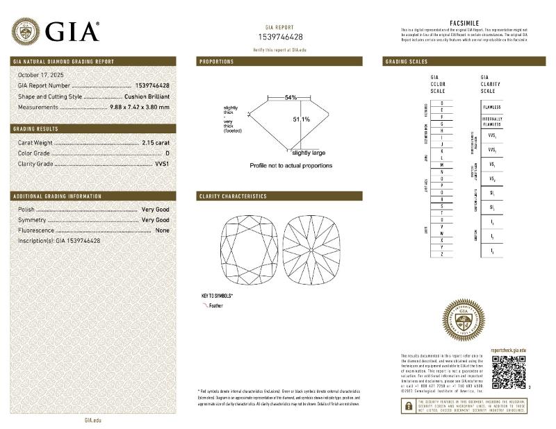 | 2.11 | Cushion Brilliant | D | IF | GIA | 51.1 | 54 | 9.88x7.42x3.80 | Contact Vendor |