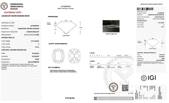 | 2.70 | Cushion Brilliant | E | VVS2 | IGI | 65.2 | 56 | 10.13x7.27x4.74 | Contact Vendor |