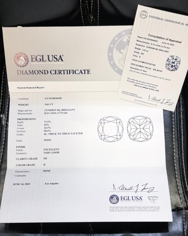 | 3.01 | Cushion Brilliant | D | SI2 | EGLUSA | 71.5 | 63 | 8.13x8.04x5.75 | Contact Vendor |