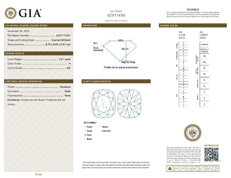 | 3.01 | Cushion Brilliant | H | VS1 | GIA | 65.9 | 62 | 8.86x8.51x5.61 | Contact Vendor |