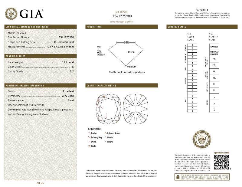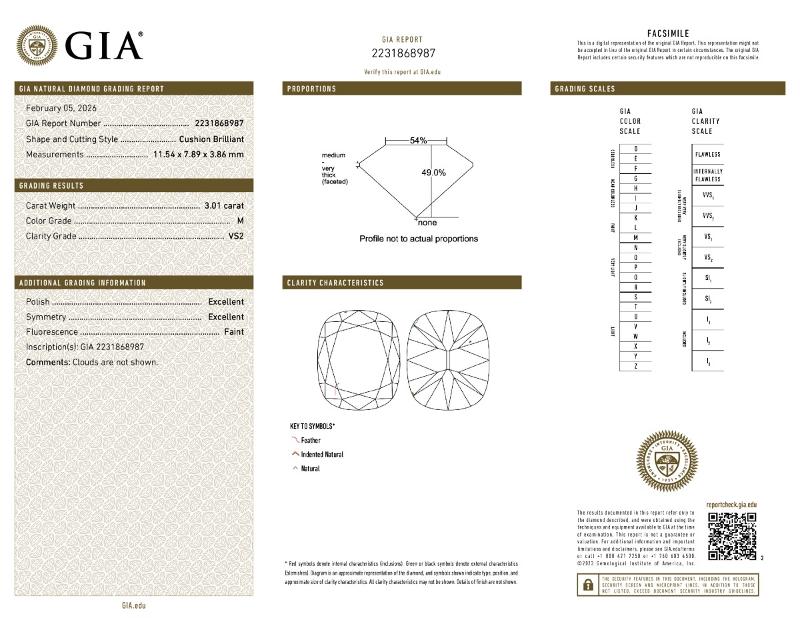 | 3.01 | Cushion Brilliant | M | VS2 | GIA | 49.0 | 54 | 11.54x7.89x3.86 | Contact Vendor |