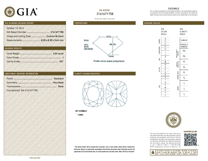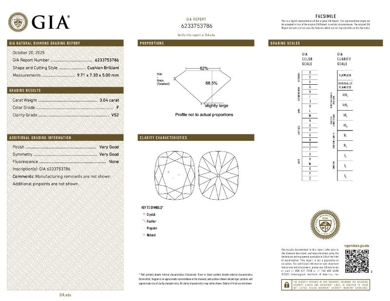 | 3.04 | Cushion Brilliant | F | VS2 | IGI | 70.4 | 65 | 9.35x7.73x5.44 | Contact Vendor |