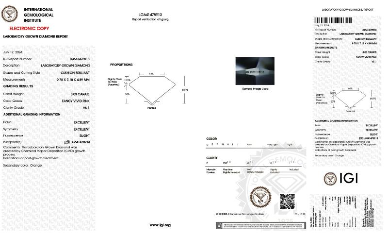 | 3.03 | Cushion Brilliant | Fancy | VS1 | IGI | 63.1 | 64 | 9.83x7.35x4.64 | Contact Vendor |