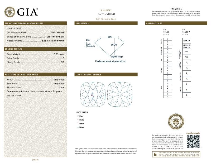 | 3.03 | Cushion Brilliant | G | SI1 | GIA | 68.2 | 60 | 8.55x8.20x5.59 | Contact Vendor |