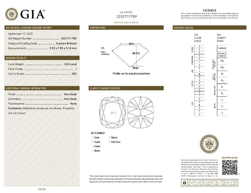 | 3.03 | Cushion Brilliant | I | VS2 | GIA | 68.6 | 58 | 9.33x7.55x5.18 | Contact Vendor |