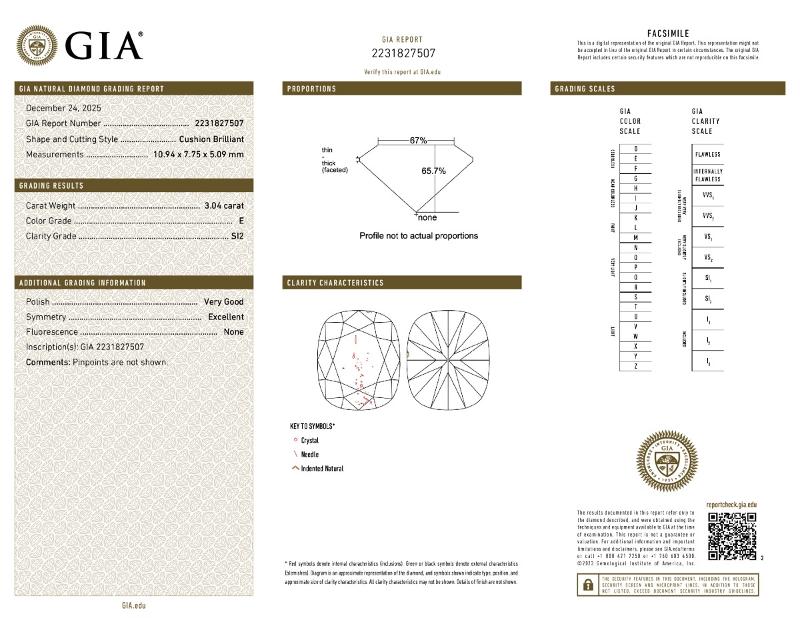 | 3.04 | Cushion Brilliant | E | SI2 | GIA | 65.7 | 67 | 10.94x7.75x5.09 | Contact Vendor |