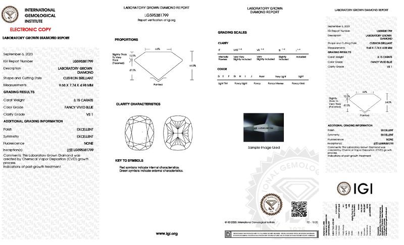 | 3.10 | Cushion Brilliant | E | VVS2 | IGI | 64.7 | 59 | 10.64x7.59x4.91 | Contact Vendor |